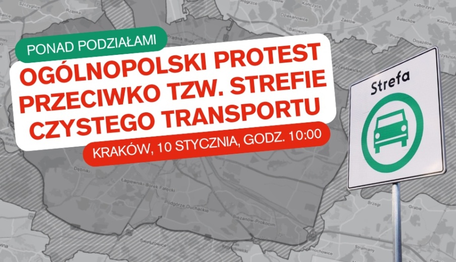 Już w sobotę 10 stycznia przed siedzibą Zarządu Dróg Miasta Krakowa odbędzie się ogólnopolski protest przeciwko Strefie Czystego Transportu. „Dość milczenia! Dość wyrzucania naszych postulatów do kosza! Dość aroganckiej polityki wymierzonej w społeczeństwo! SCT to nie ekologia – to ideologia, która uderza w naszą wolność i prawo własności. Te strefy uderzają w najsłabszych: seniorów, rodziny i osoby mniej zamożne. Nie pozwólmy na wykluczenie komunikacyjne i przymusowe opłaty!” – napisaliśmy w zaproszeniu skierowanym do czytelników mediów społecznościowych.